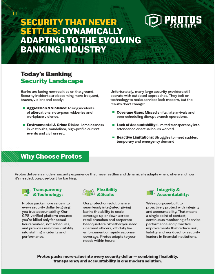 By managing and coordinating relationships with thousands of local owner/operator security vendors, Protos can quickly assemble expert teams to adapt to any situation, at any of your locations. We also offer second-to-none coverage through the nation’s largest off-duty law enforcement network. Our team can help protect financial institutions, ATM centers, banking offices, retail branches, credit unions and more.