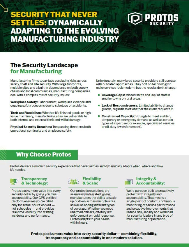 That’s why Protos offers comprehensive manufacturing and industrial security services across factories, warehouses and distribution centers. Our officers effectively deter crime, prioritizing the protection of personnel above all, while also safeguarding inventory, maintaining the company’s reputation and preventing financial loss.