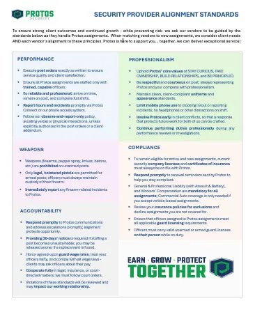 This Agreement sets forth the terms under which Security Provider will provide security guarding services to Protos clients. The Parties enter into this Agreement in order to maintain a professional, transparent, and collaborative working relationship focused on operational effectiveness and service quality. The Parties acknowledge that ongoing communication, good-faith cooperation, and responsiveness support both the effective performance of this Agreement as well as the delivery of reliable, high-quality services to Protos clients.